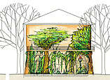 Daniel Schweizer hat in Abstimmung mit dem Stadtbauamt für die Fassade des Wasserturms ein umlaufendes Motiv aus Bäumen, Farnen und Blumen entworfen. Das Motiv nimmt die Architektur des Gebäudes auf, so wirkt etwa der Balkon mit Geländer wie ein „Skywalk“ zwischen den Baumkronen, einige Pfeiler werden zu Baumstämmen und entlang der Bögen schmiegen sich Farne und andere Waldpflanzen.