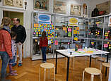 Um 11 Uhr öffnete "Hausmeister Träge" alias Museumsführer Claudius Beck das Haus, um in seiner unnachahmlichen Art Geschichte(n) der Schule in den historischen Klassenzimmern zu erzählen. Um 12 Uhr folgte ihm Margarete Zinser als "Fräulein Lehrerin", die eindrücklich zeigte, wie sehr die Schule früher von Disziplin und Strenge geprägt war. Da war es danach eine schöne Abwechslung, in der Kreativwerkstatt Blumen aus Krepp zu basteln, 3D-Fotos in Matrosenverkleidung zu schießen oder beim Food-Truck Bashar Falafel vegetarische oder vegane Spezialitäten zu schnabulieren. Und auch die Schülerinnen und Schüler der K1 des Karl-Maybach-Gymnasiums konnten sich an ihrem Waffelstand sowie bei Kaffee und Kuchen über jede Menge Nachfrage freuen. Genau wie die Mitmach-Werkstatt im zweiten Stock, bei dem Besucherinnen und Besucher dem Team mit Erinnerungen aus ihrer Kindheit wichtigen Input für das Museum der Zukunft schenken konnten.